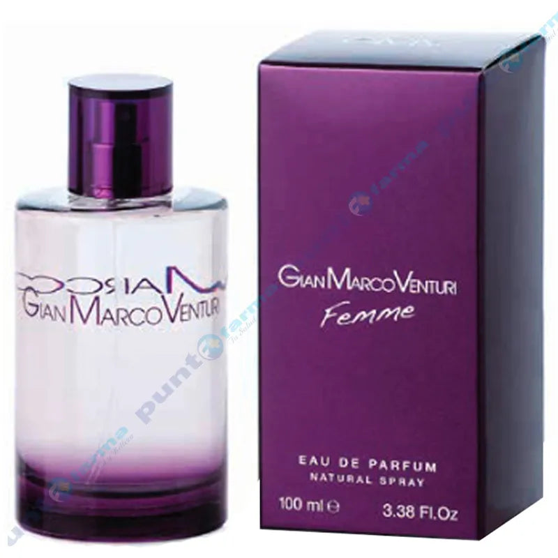 Gian Marco Venturi Femme es una fragancia de la familia olfativa floral para mujeres, se lanzó en 2015. Las notas de salida son frutas, las notas de corazón son flores, las notas de fondo son notas atalcadas y notas amaderadas. Beneficios del producto: Es una fragancia atalcada, amaderada y floral. Afrutada y dulce. Modo de Uso: Aplicación: Atomizar a 20 cm del cuerpo en las zonas: Muñecas, cuello, pliegues de los codos, tobillos.
